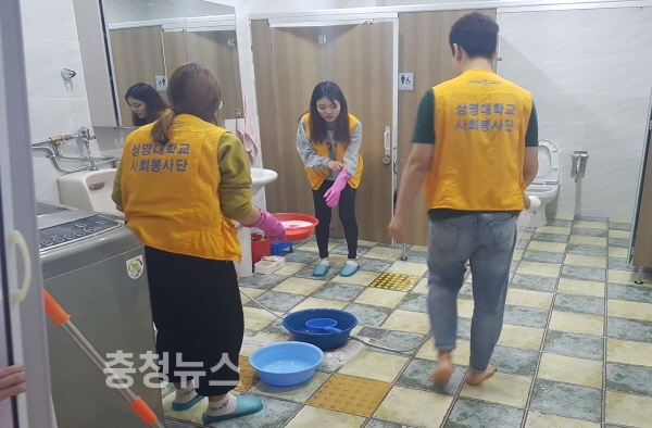 청소봉사 중인 상명대 학생들