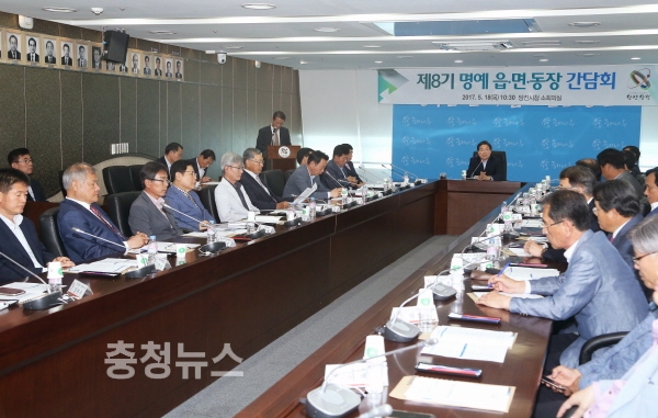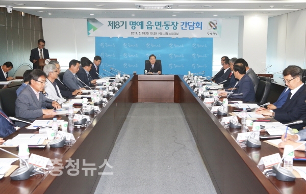충남 당진시는 18일 지난해 1월 위촉된 제8기 명예읍면동장 14명을 초청해 김홍장 시장 주재로 간담회를 갖고 지역 현안사업 해결에 머리를 맞댔다.