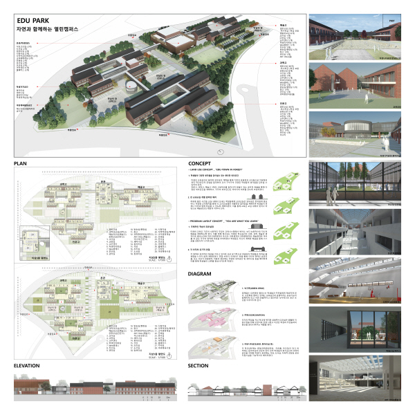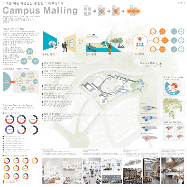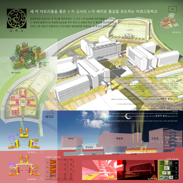 수상작은 ▲대상 ‘Campus Malling’(대표 강성인) ▲최우수상 ‘Edu-Park’(대표 김상효) ▲우수상 ‘삼족오고(三足烏高)’(대표 옥태범), ‘Choreography’(대표 유명희), ‘꿈의 둥지 학교’(대표 최선미) 등 총 5개이다.