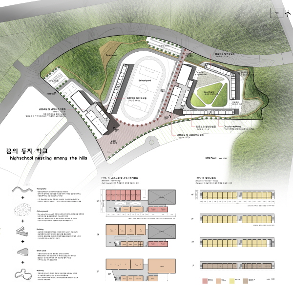학교 시설물을 저층화(기존 4〜5층 단일동 → 1〜3층 다수동)시키고, 다양한 형태의 마당을 배치하여 학생들의 외부활동을 장려하고 자연친화적인 학습을 유도한다.