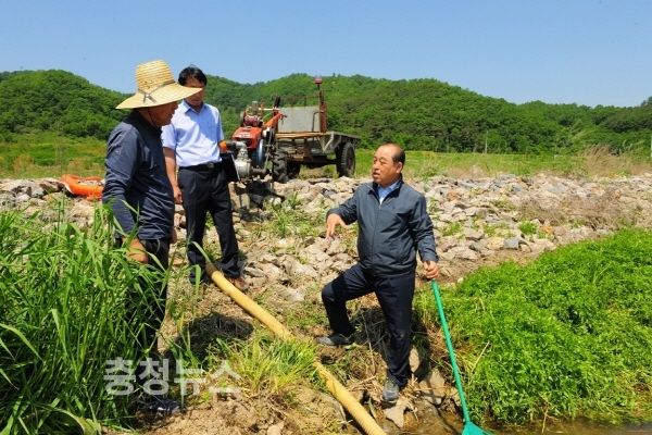 황선봉 군수가 가뭄 현장 및 저수지 등을 방문해 가뭄피해 현황을 살펴보고 있다