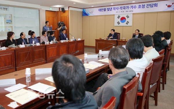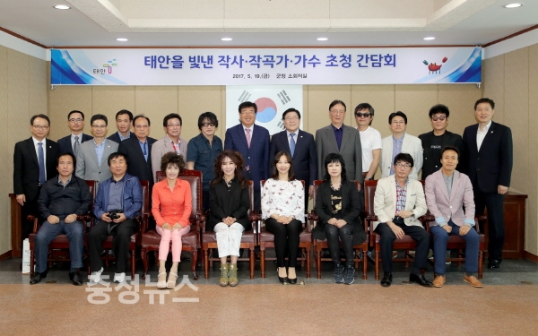 충남 태안군은 19일 군청 소회의실에서 한상기 군수를 비롯한 군 관계자와 태안을 노래한 작사가·작곡가·가수 16명 등 30여 명이 참석한 가운데 ‘태안을 빛낸 작사·작곡가·가수 초청 간담회’를 가졌다고 밝혔다.