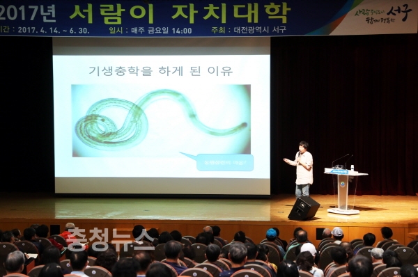 지난 19일 구청 대강당에서 열린 서람이 자치대학 제4강은 기생충 전문가 서민 단국대 교수가 강사로 나서 ‘기생충과 인간’을 주제로 주민들께 재미와 감동을 선사했다.