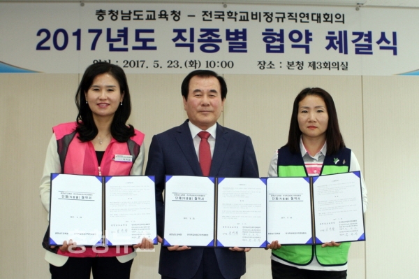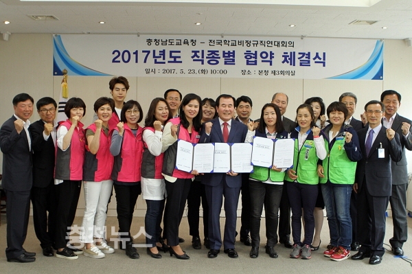 충남도교육청(교육감 김지철)은 23일 본청 제3회의실에서 전국학교비정규직연대회의와 직종별 협약을 체결했다.