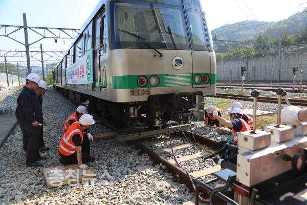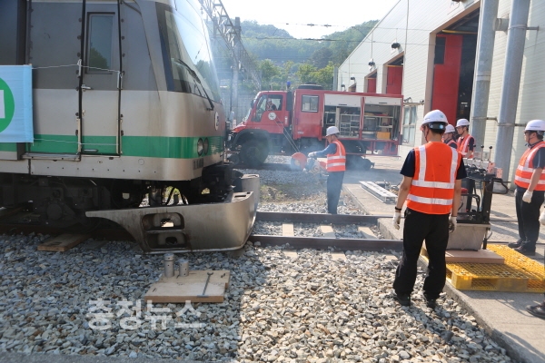 대전도시철도공사(사장 김민기)는 25일 판암차량기지에서 임직원 40명이 참여한 가운데‘전동차 탈선사고 복구 훈련’을 실시했다.