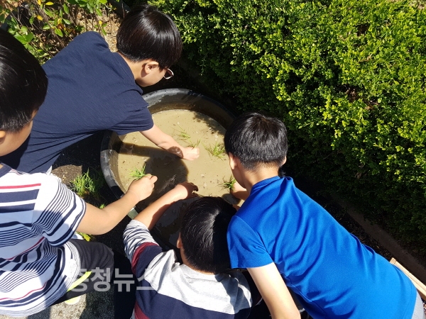체험에 앞서 학생들은 모심기, 벼베기, 수확 등 논의 한살이에 대해 배워보고, 모 심는 방법에 대한 설명을 들은 후 고무 화분에 모를 식재했다.