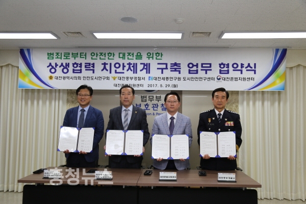 이날 업무협약은 태경환 중부경찰서장, 대전준법지원센터 성우제 보호관찰소장, 대전시 의회 안전도시연구회 회장 김동섭 의원, 대전세종연구원 도시안전연구센터장 이형복 박사가 한 자리에 모여 공동체 치안 활성화 체계를 구축하고 사회 안전시스템 확충을 위해 범죄예방을 위한 도시환경 설계에 손을 맞잡았다.