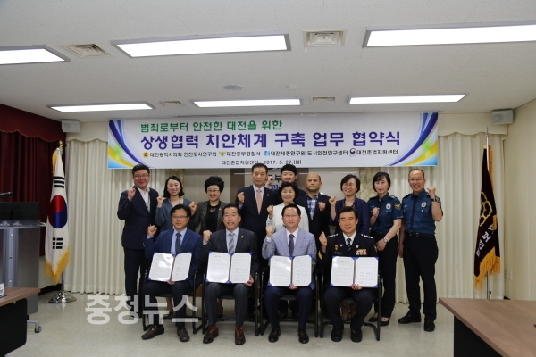 대전중부경찰서 생활안전계(계장 홍재구)는 29일 대전 준법지원센터 5층 회의실에서 범죄로부터 안전한 대전을 위한 업무협약을 체결했다.