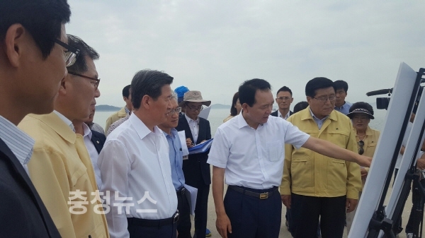 성일종 의원이 지난 해 8월 해수부차관과 천수만양식업 피해 현장을 점검하고 있다