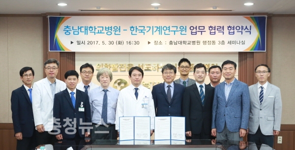 충남대학교병원(원장 송민호)은 30일 충남대학교병원 행정동 3층 세미나실에서 한국기계연구원(원장 박천홍)과 연구협력 기술교류 협약을 체결했다.