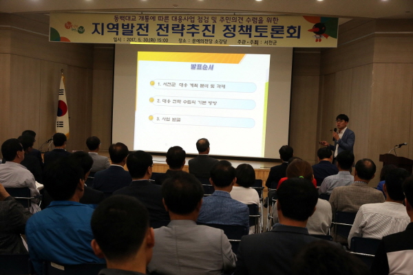 충남 서천군(노박래 군수)은 지난 30일 문예의 전당에서 전문가와 지역대표 및 주민 100여 명이 참석한 가운데 ‘동백대교 개통 대응 지역발전 전략추진 정책토론회’를 개최했다.