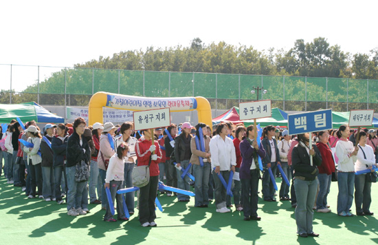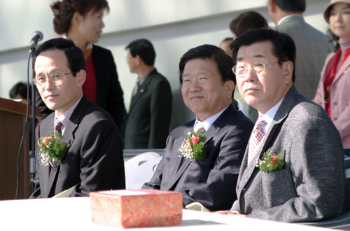 대전광역시 가정어린이집 연합회(회장 김영미)가 10월 22일 남선공원 잔디구장에서 ‘보육인 한마음축제’를 개최했다. 가정에서 영유아를 양육하는 대전시내 보육인들이 서로 단결하고 화합하는 자리. 5개구 보육인들은 청팀과 백팀 둘로 나누어 줄다리기, 애드벌룬 굴리기, 10인 11각 등의 경기를 펼치게 된다. 김영미 회장은 “어린 꿈나무들을 돌보느라 온마음으로 노력해온 시설장님과 선생님들이 오늘 하루 멋진 추억을 만들기 바란다”고 대회사에 가름했다. ▲ 가기산 서구청장, 열린우리당 박병석 의원, 열린우리당 구논회 의원(오른쪽부터) 등이 개회식에 참석했다.