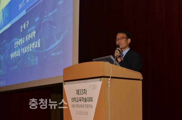 건양대학교(총장 김희수) 의대 강재구 교수(의료인문학실장)가 지난 2일 대전컨벤션센터에서 열린 제33차 의학교육학술대회에서 건양대 의대만의 ‘환자를 위한 휴머니즘적 역량 강화 교육과정’에 대한 발표를 진행했다.
