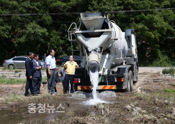 청양군에 따르면 3일 비봉면 강정리에 소재한 제일레미콘(주)(대표 김종관)이 농업용수가 부족해 모내기를 못하고 있는 대치면 시전리 240번지 2595㎡ 면적의 논에 레미콘차량을 이용 필요한 물을를 공급해 줬다.