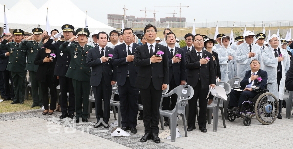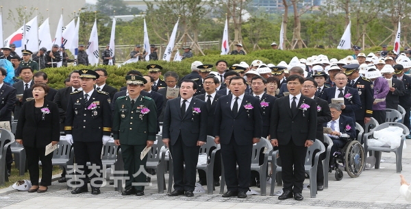 충남보훈공원에서 열린 이날 추념식은 안희정 지사와 김지철 도교육감, 김재원 도 경찰청장, 전몰군경유족회 등 9개 보훈단체장 및 보훈가족 등 800여 명이 참가한 가운데 열렸다.