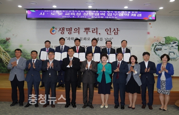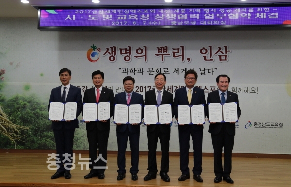 권선택 대전시장, 이춘희 세종시장, 안희정 충남도지사, 설동호 대전시교육감, 최교진 세종시교육감, 김지철 충남도교육감은 7일 충남도청 대회의실에서 ‘2017 금산세계인삼엑스포와 대전·세종 지역 행사 성공 개최를 위한 상생협력 업무협약’을 체결했다.