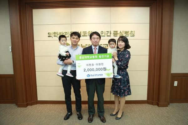 그런데 기부를 어디에 할 것인지도 고민이었다. 부부는 올 초 아이가 아파 병원을 방문한 적이 있었는데 병원에서 어린아이들이 병마와 씨름하던 장면을 기억해냈다. 그리고는 충남대병원에 2백만원을 기부하기로 결정하였다.