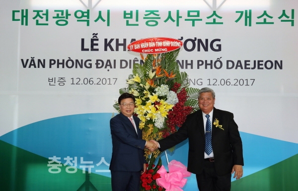 대전시(시장 권선택)는 지역기업의 동남아시아 판로지원을 위해 베트남 빈증성과 호치민시에‘대전광역시 빈증통상사무소’와 ‘대전광역시 호치민통상사무소’를 개소했다고 13일 밝혔다.