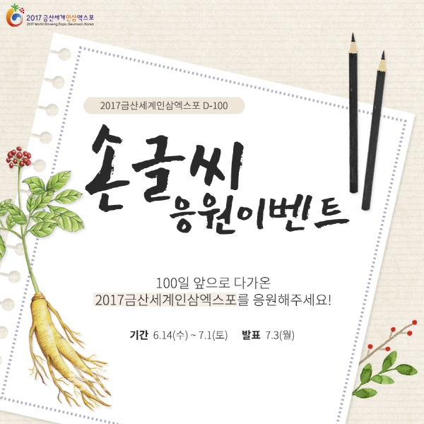2017금산세계인삼엑스포 성공개최를 응원하는 내용을 정성을 다해 손글씨로 써서 엑스포 공식 페이스북을 방문해 사진댓글을 남기면 되고 페이스북 게시물의 ‘좋아요’를 누르거나 공유를 할수록 당첨확률은 높아진다.