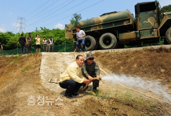 이에 군은 지난 13일부터 15일까지 3일간 1789부대 4대대의 사단 화학지원대 급수 차량 3대와 보명레미콘의 차량 10여대 및 용수를 지원받아 신양면 대덕리와 시왕리, 불원리, 녹문리, 여래미리 등의 가뭄 현장에 농업용수를 공급하고 있다.