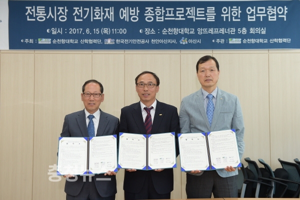 충남 아산시는 한국전기안전공사 천안아산지사, 순천향대학교와 함께 지난 15일 순천향대학교에서 전통시장 전기재해 예방을 위한 협약을 체결했다.