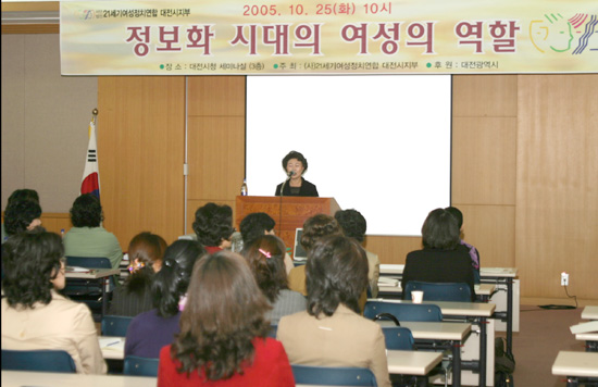 ‘정보화 시대의 여성의 역할’을 주제로 21세기여성정치연합 대전시지부가 강연회를 개최했다. 25일 오전 10시부터 대전시청 3층 세미나실에서 진행된 이번 강좌는 한국정보통신대학교 허운나 총장이 강사로 초빙됐다. 개회식에서 김혜자 21세기여성정치연합 대전시지부 회장은 “지난 두 달 동안 2005 여성정치대학을 무사히 마치고 모의 의회까지 개최한 여러분을 보면서 매우 뿌듯했다. 앞으로 적극적인 사회참여는 물론 의회에 진출하는 여성들이 많아졌으면 한다”고 말했다. 이어진 축사에서 박성효 대전시 정부부시장은 “여성의 시대가 도래했음을 인정하지 않을 수 없다. 여성의 정보화 능력 또한 남성보다 뛰어난 것으로 알고 있으며, 이러한 장점을 가진 여성들이 정치 분야로 진출한다면 우리나라의 정치가 훨씬 발전할 것”이라고 전했다. ▲ 이날 강의를 맡은 ICU 허운나 총장과(좌), 21여성정치연합 대전시지부 김혜자 회장(우).