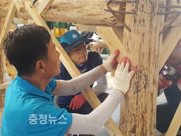 제15회 부여서동연꽃축제를 찾는 관람객들에게 안락한 쉼터를 제공하기 위한 준비로 구슬땀을 흘리고 있다.