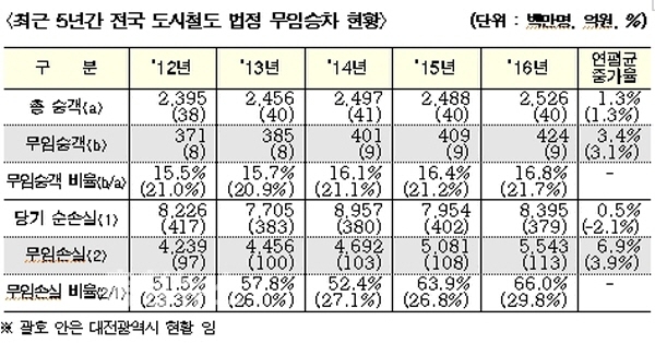 그간 급격한 고령화와 도시철도 노선의 광역화, 정부의 유공자 보훈정책 강화 등으로 법정 무임승차자가 급증한 결과, ’16년 전국 도시철도 법정 무임승차자는 4억2천만명(대전 9백만명)에 달하며 그에 따른 운임손실도 5,543억원(대전 113억원)으로 집계되었고, 계속되는 고령화 추세로 무임승차자는 더욱 늘어날 전망이다.
