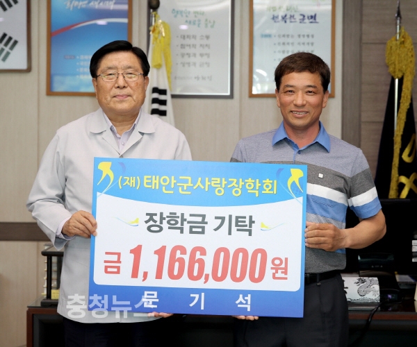 태안군 문기석 씨(제일쌀상회 운영, 前 태안특산물전통시장 상인회 회장)가 지난 22일 (재)태안군사랑장학회에 장학금 116만 6천원을 기탁했다.