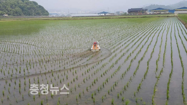 충남 청양군은 농촌의 고령화에 대응하고 노동력 절감과 생산성 향상을 위해 벼농사 시범사업으로 무인보트를 활용한 본답 중기제초제 살포기술을 보급한다고 26일 밝혔다.