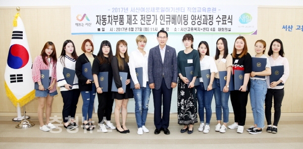 충남 서산시에서 운영하는 여성새로일하기센터가 직업교육훈련인‘자동차부품 제조 전문가 인큐베이팅 양성과정’의 수료식을 27일 서산고용복지플러스센터에서 가졌다.