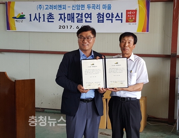 충남 예산군은 28일 신암면 두곡리 마을회관에서 신암면 두곡리(이장 이경주)와 신암농공단지에 위치한 동물 약품 제조업체 ㈜고려비엔피(대표 김태환)가 마을발전을 위한 1사 1촌 자매결연을 체결했다고 밝혔다.