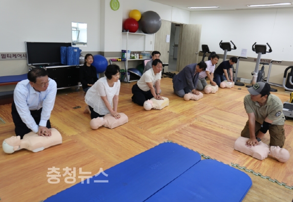 중부대 멀티케어사업단 주관으로 27일 충청캠퍼스 건원관 헬스케어실에서 열린 교육과정에는 홍승용 총장, 이정열 부총장 외에 여러 보직교수들이 참여해 이론과 실습 교육 과정을 이수했다.
