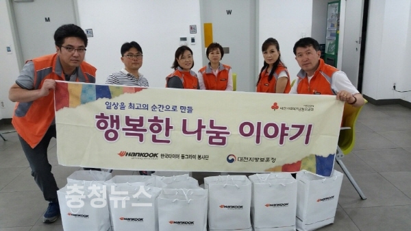 한국타이어대전공장 동그라미봉사단(회장 김홍렬)은 대전지방보훈청(청장 강윤진)과 함께 지난 28일 건강한 먹거리(밑반찬)지원 활동으로 대덕구에 거주하는 국가유공자 10명에게 ‘행복한 나눔 이야’를 실시했다.