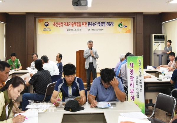 충남 서천군농업기술센터(소장 석희성)는 농촌진흥청 국립축산과학원과 함께 지난 29일 농업기술센터 강의실에서 한우농가 60여명을 대상으로 전문가 종합컨설팅을 실시했다.