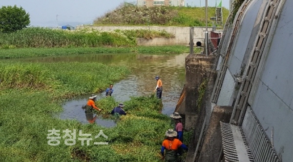 이를위해 지난 29 ~ 30일 양일간 배수장 주변의 수초제거와 청양군과 배수로 준설은 물론 배수로 수초 제거에 만전을 기하고 있다.