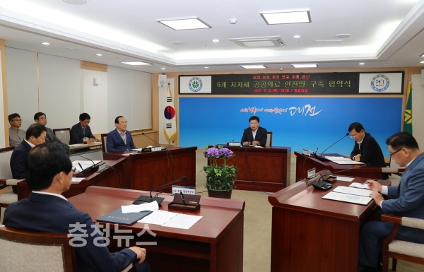 대전시는 6일 시청 중회의실에서 대전을 의료 생활권으로 하고 있는 충북 보은군, 옥천군, 영동군, 충남 계룡시, 금산군과 ‘공공의료안전망 구축 및 재난 공동대응 협약’을 체결했다.