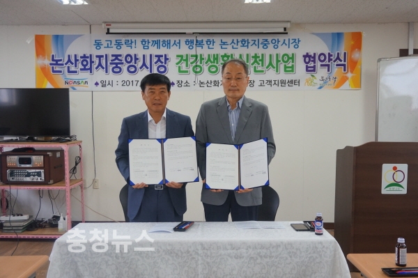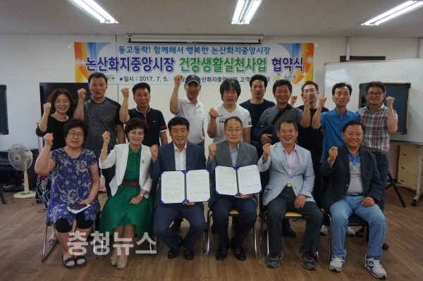 충남 논산시(시장 황명선)은 지난 5일 논산화지중앙시장 상인회 회의실에서 논산화지중앙시장상인회(회장 박형래)와 ‘건강생활실천사업 제휴 협약’을 체결했다.