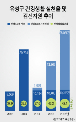 한편, 초등학교 6학년을 대상으로 하는 흡연예방 집중교육, 취약지 경로당 어르신을 대상으로 하는 한방 양생프로그램, 건강생활실천을 위한 5落실 운영 등 맞춤형 건강증진사업도 꾸준히 추진 중이며, 건강 100세 버스는 유성관내를 순회하면서 기초건강 측정, 질환 상담 등을 통해 주민들의 뜨거운 호응을 받고 있다.