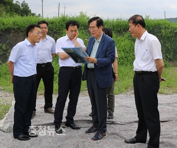 김현권 더불어민주당 의원이 7일 농어촌공사 충남본부(본부장 김병찬)에서 추진중인 공주보-예당호 용수이용체계재편사업지구 사업현장을 찾아 항구적 재해대책사업 공사 추진현황을 점검했다.