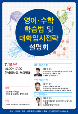 대전 대덕구(구청장 박수범)는 오는 15일 오후 2시 한남대학교 서의필홀에서 수험생과 학부모의 궁금증 해소를 위해 최고 수준의 입시전문가들을 초청해 ‘영어·수학 학습법 및 대학입시전략 설명회’를 개최한다.