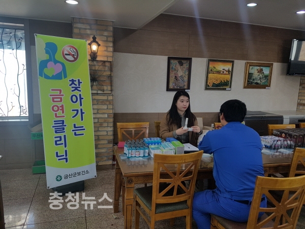 금산군 보건소에서는 금연의지는 있으나 바쁜 직장생활로 금연클리닉을 이용하지 못하는 산업장을 대상으로 찾아가는 이동금연클리닉을 운영하고 있으며, 금연을 희망하는 직원이 10명이상이면 신청이 가능하다.