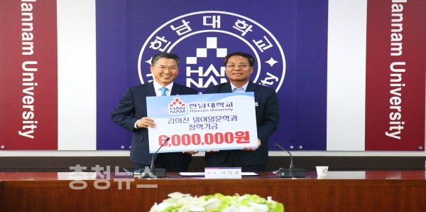 ㈜나노하이테크 김병순 대표(왼쪽)가 이덕훈 한남대 총장에게 일어일문학과 장학기금 600만 원을 기탁하고 있다.