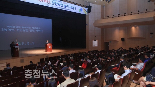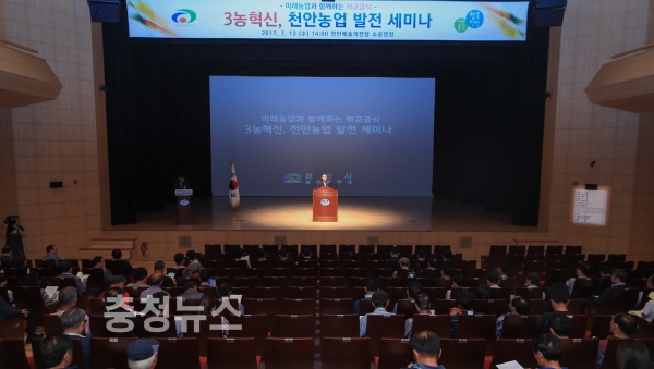 충남 천안시는 12일 천안예술의전당에서 농업인, 영양교사, 학교급식 관련자 등 300여명이 참석한 가운데 ‘미래농업과 함께하는 학교급식’을 주제로 농업발전 세미나를 개최했다.
