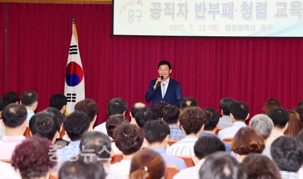 대전 중구(구청장 박용갑)는 13일 구청 대회의실에서 직원들의 청렴마인드 함양을 통한 청렴중구 만들기를 위해 직원 200여 명이 참석한 가운데 ‘2017 공직자 반부패 및 청렴교육’을 실시했다.