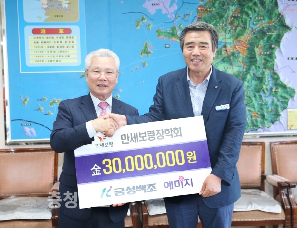 충남 보령시는 지난 13일 오후 시장실에서 김동일 시장과 ㈜금성백조 정성욱 회장이 참석한 가운데 보령지역 인재 육성을 위한 장학금 기탁식을 가졌다고 밝혔다.