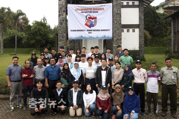 한밭대 글로벌 엔지니어링 프로젝트에 참가한 한밭대-인도네시아 텔콤대학 학생과 관계자들이 기념촬영을 하고 있다.