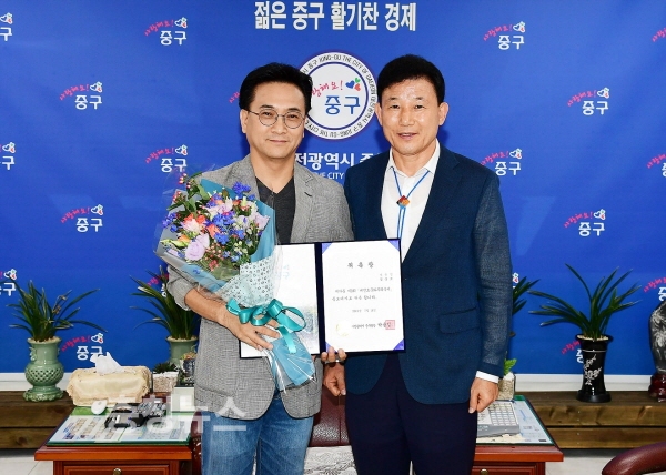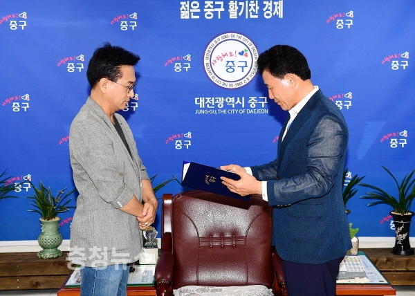 대전 중구(구청장 박용갑)는 지난 18일 구청 구민사랑방에서 효문화뿌리축제를 널리 홍보하고자 방송인 김준모씨를 ‘제9회 대전효문화뿌리축제 홍보대사’로 위촉했다.
