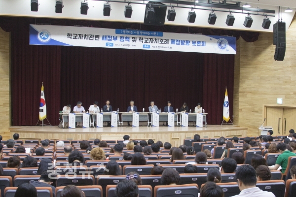 세종시교육청은 20일 교육청 2층 대강당에서 유·초·중·고 교원, 학부모, 중·고등학교 학생회장단, 교육청 직원, 시민단체 회원 등 약 300여명이 참석한 가운데 「학교자치 관련 새정부 정책방향 및 학교자치조례 제정방향 토론회」를 개최했다.