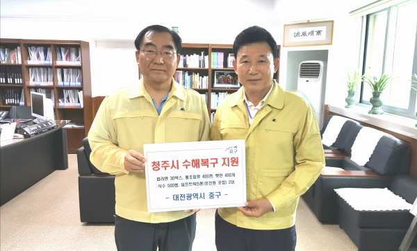 대전 중구(구청장 박용갑)는 20일 최악의 물 폭탄 집중호우로 도심 곳곳에 침수피해가 발생한 청주 미원면의 수해복구 지원을 위해 생필품과 함께 덤프트럭과 운전요원을 현지로 파견했다.